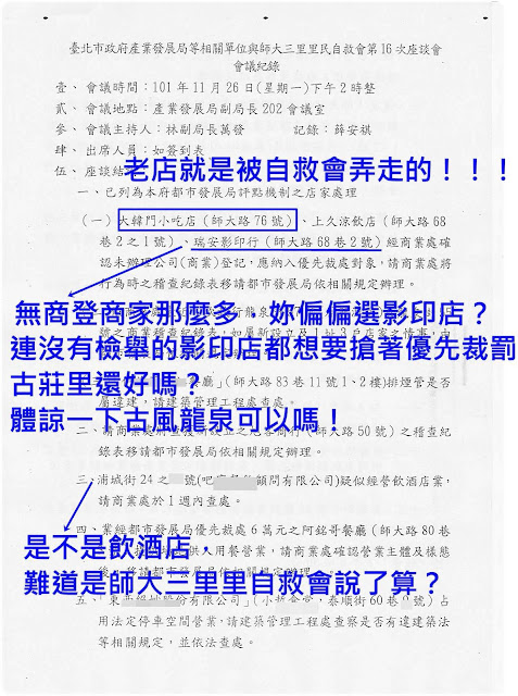 師大三里里民自救會非常反商,除了禁連合法的商家想要成立組織,自律管理,他也要硬要說人家是要觀光,不准人家合法成立組織,連合法商家都要反。