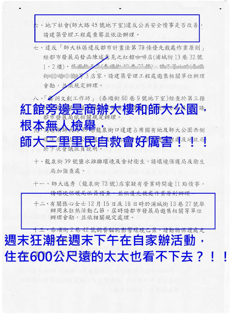師大三里里民自救會不只反對合法的藝文空間、裱框店、書店、出版社、花店、影印店...,他連舊衣回收箱、停車場、學生塗鴉、掛五星旗的老外、師大公園、世居浦城街13巷的居民在家自辦活動...全部都看不順眼!!!